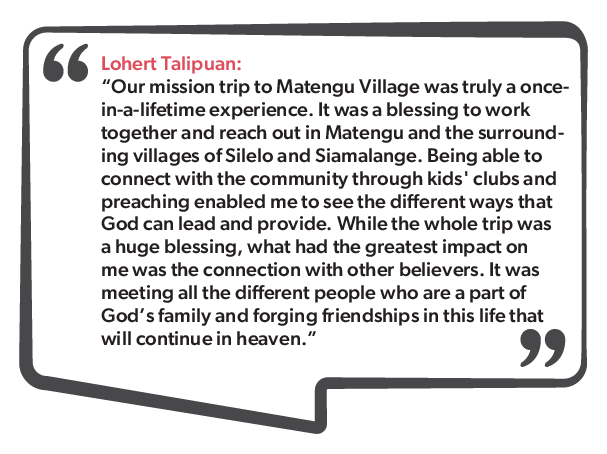 Each afternoon, our mission team would divide into three groups and run kids’ clubs across three sites in the nearby communities: one in Matengu, one in Silelo and one in Siamalange. This involved organising crafts for the kids, singing songs and playing games, and teaching the kids stories from the Bible—with the help of translators. Following this, each site ran an evangelistic campaign focusing on fundamental Adventist topics such as the gospel, the Sabbath, the second coming and baptism. Many of the missionaries volunteered to preach these sermons.
